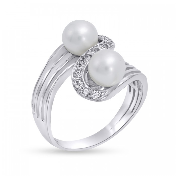 Ένα εντυπωσιακό δαχτυλίδι 14 καρατίων,λευκόχρυσο με λευκά ζιργκόν και δύο μαργαριτάρια. Υπέροχη πρόταση για δώρο. Το νούμερο δαχτυλιδιού είναι Νο55 κατόπιν παραγγελίας μπορείτε να επιλέξετε την διάσταση που επιθυμείτε.