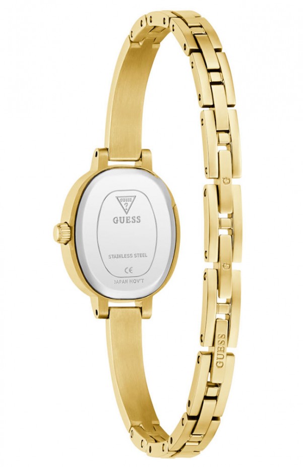 Γυναικείο ρολόι GUESS PENELOPE GW0924L2 διαμέτρου 21mm, με μηχανισμό QUARTZ ακριβείας, χρυσό καντράν, κάσα και μπρασελέ από ανακυκλωμένο ατσάλι.