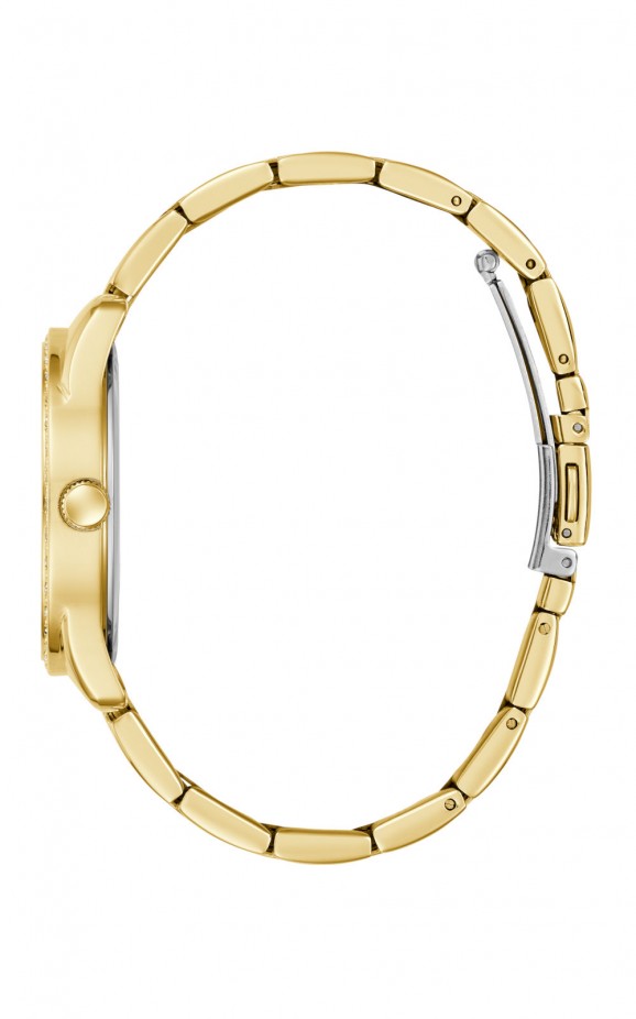 Ένα κομψό γυναικείο ρολόι GUESS ROXY GW0987L2 διαμέτρου 36mm, με μηχανισμό QUARTZ ακριβείας, χρυσό καντράν, κάσα και μπρασελέ από ανακυκλωμένο ατσάλι.