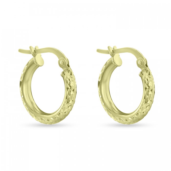 Διακριτικά και κομψά σκουλαρίκια-κρίκοι σε κίτρινο χρυσό στα 9 καράτια, διαστάσεως 1.4 cm με διαμανταριμένο φινίρισμα. Ευκολοφόρετα για όλες τις ώρες.