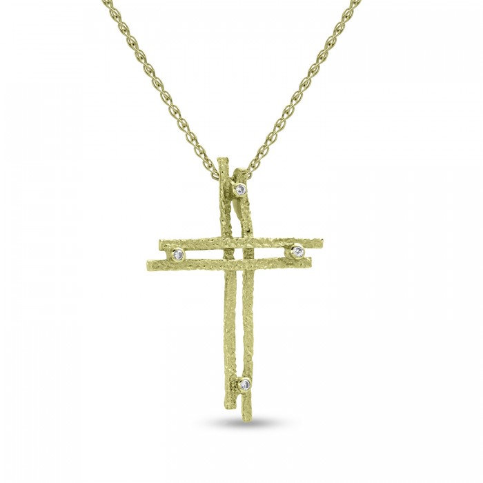 Ένας μοντέρνος και ιδιαίτερος γυναικείος σταυρός σε χρυσό 14 καρατίων, διακοσμημένος με διακριτικά λ..