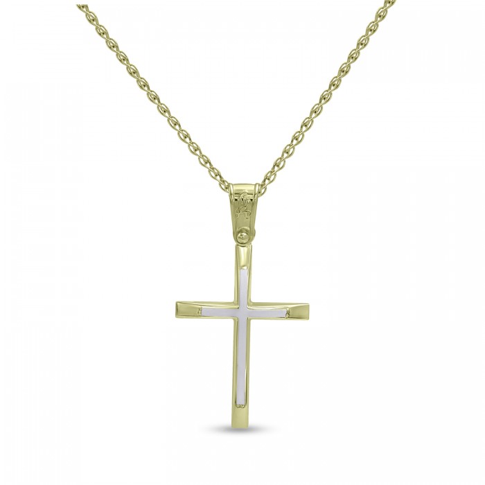 Ένας μοντέρνος και ιδιαίτερος σταυρός σε χρυσό 14 καρατίων, με ματ και γυαλιστερό φινίρισμα. Κατάλληλος για κάθε περίσταση,διαθέτει αλυσίδα 40 εκατοστών.
