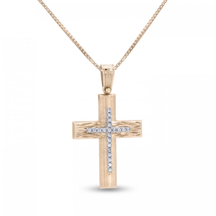 Σταυρός Με Αλυσίδα Ροζ Χρυσό, 14 Καράτια, Λευκά Ζιργκόν oro2827
