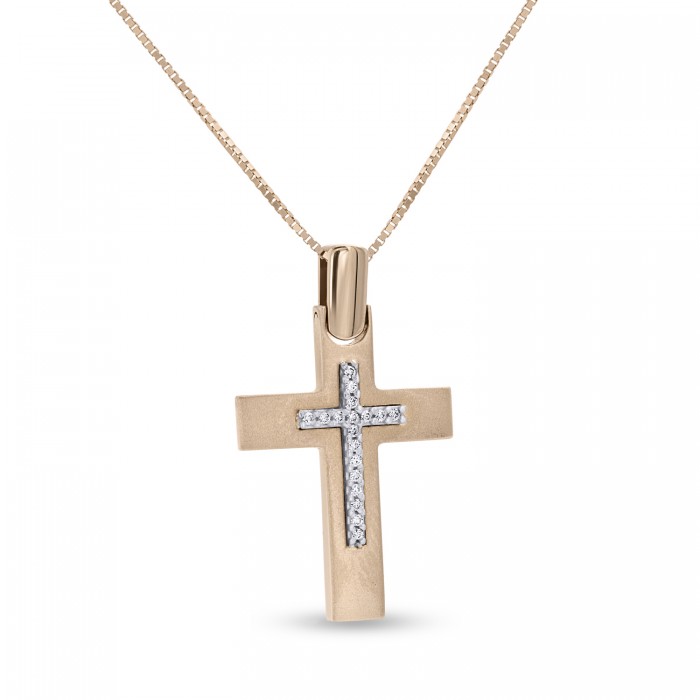 Σταυρός Με Αλυσίδα Ροζ Χρυσό, 14 Καράτια, Λευκά Ζιργκόν oro2833