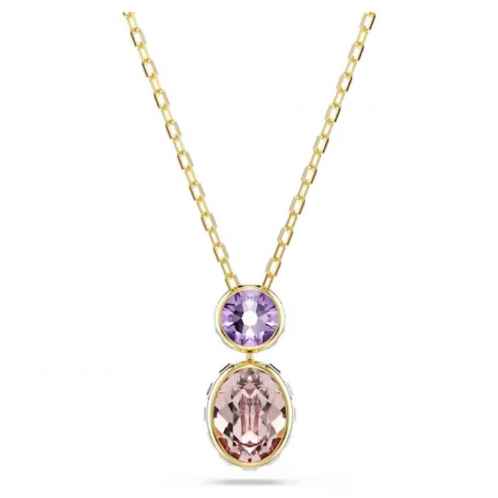 Με αυτό το μενταγιόν Chroma, μπορείτε να περιστρέψετε το κρύσταλλο για να ταιριάζει στη διάθεσή σας. Το σχέδιο σε χρυσό τόνο διαθέτει ένα κεντρικό μοβ κρύσταλλο και ένα μεγαλύτερο κρύσταλλο διπλής όψης από κάτω, το οποίο είναι διαφανές από τη μία πλευρά και ροζ από την άλλη. Περιστρέψτε το ανά πάσα στιγμή για να παίξετε με την προσωπική σας έκφραση.