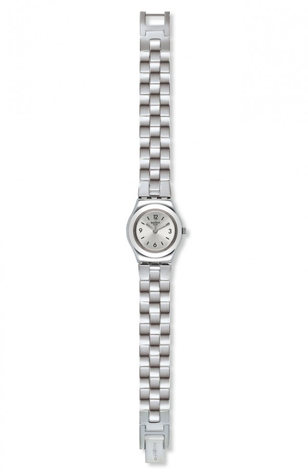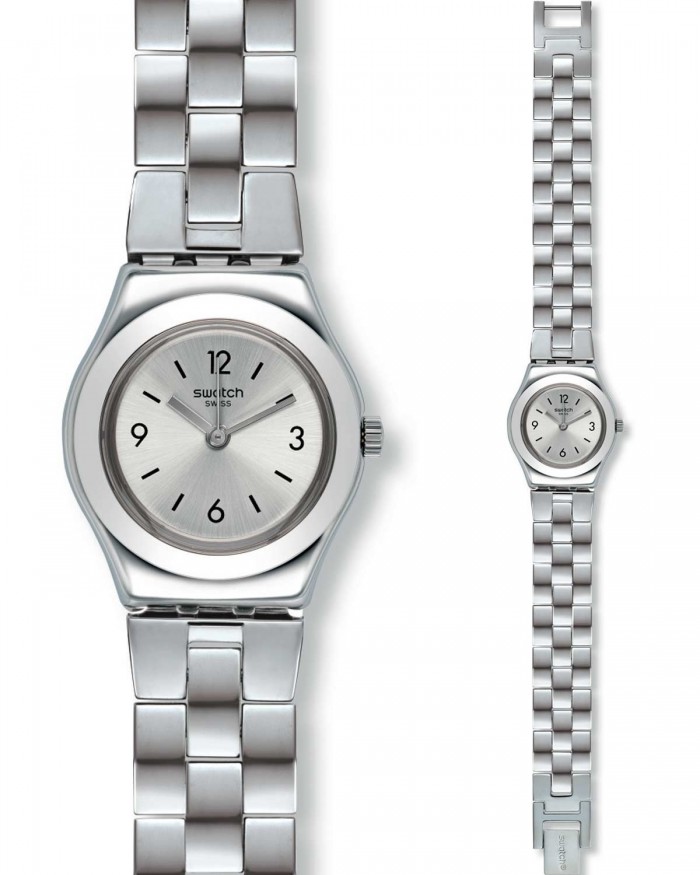 Ένα όμορφο διακριτικό ρολόι ελβετικής κατασκευής από την Swatch με ασημί ανοξείδωτο ατσάλινο μπρασελέ και ασημί καντράν.