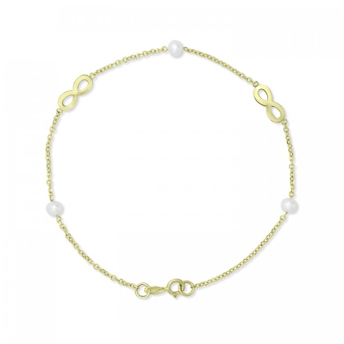 Κοσμήστε τον καρπό σας με φως φορώντας αυτό το λαμπερό βραχιόλι σε σχήμα άπειρο με μαργαριτάρια,χρυσό στα 9 καράτια.