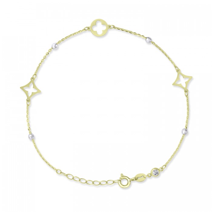 Κοσμήστε τον καρπό σας με φως φορώντας αυτό το λαμπερό βραχιόλι,χρυσό στα 14 καράτια με διάφορα σύμβολα και λευκόχρυσες μπίλιες.Διαθέτει κρικάκια για να το προσαρμόσετε στο επιθυμητό ύψος.